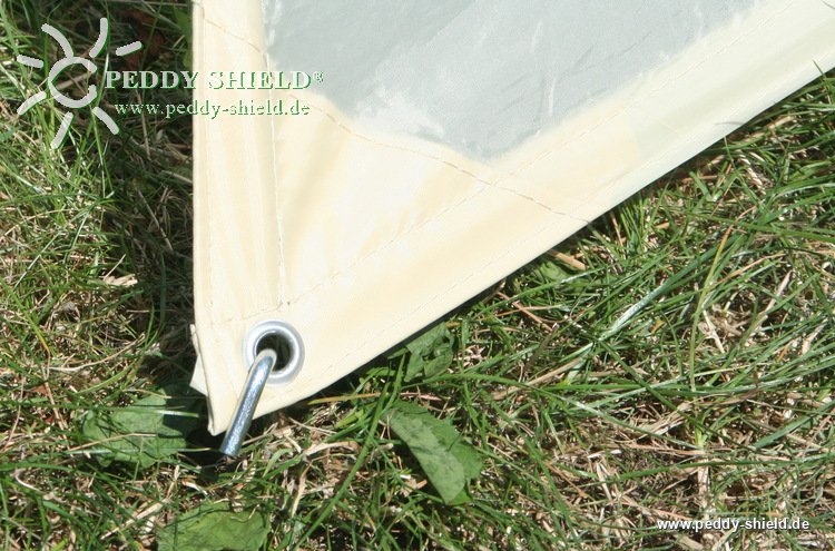 1. Segel mit der langen Seite 3,0 m auf dem Untergrund (Rasen, Sand etc.) mit zwei Stabheringen feststecken - die Stabheringe schräg in Richtung auf das geöffnete Segel einstecken (besserer Halt)