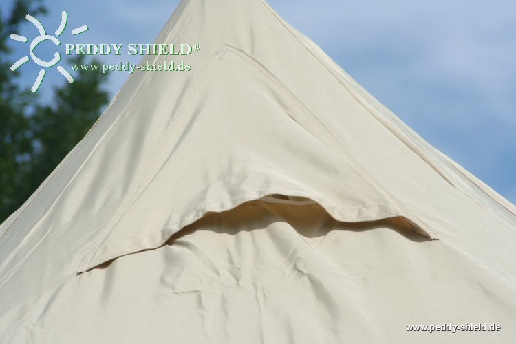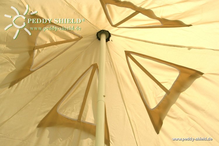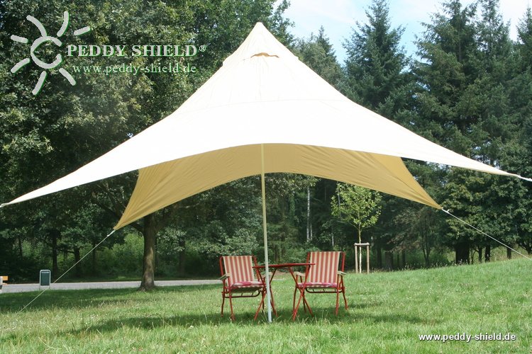 Kein Wärmestau - weil der Windtunnel die aufgeheizte warme Luft nach oben raus läßt - bei großer Hitze ist das wirklich entscheidend: die augewärmte Luft steigt nach oben und entweicht über die extra eingebauten Windtunnel - außerdem kann unten der Wind im Schatten Erfrischung bringen - ein gut belüfteter SChattenplatz zum Entspannen oder ARbeiten im Freien - auch Veranstalter werden dieses Segelpyramide schätzen weil sie nicht nur Schatten spendet, sondern auch einen guten Regenschutz darstellt, wenn es dabei nicht zu sehr windet (aber da kann ja zusätzlich der mobile Paravent helfen)