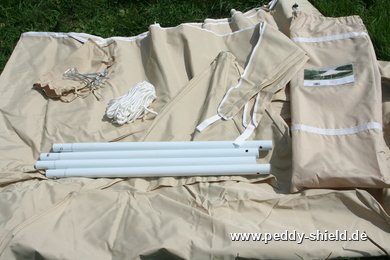 3. das komplette Segelset ist vorbereitet für eine Aufstellung auf unbefesigten Flächen - natürlich lassen sich die Perkordeln auch vorhandenen Festpunkten ausspannen oder mit Ringösenschrauben auf Holz- oder auch Steinflächen